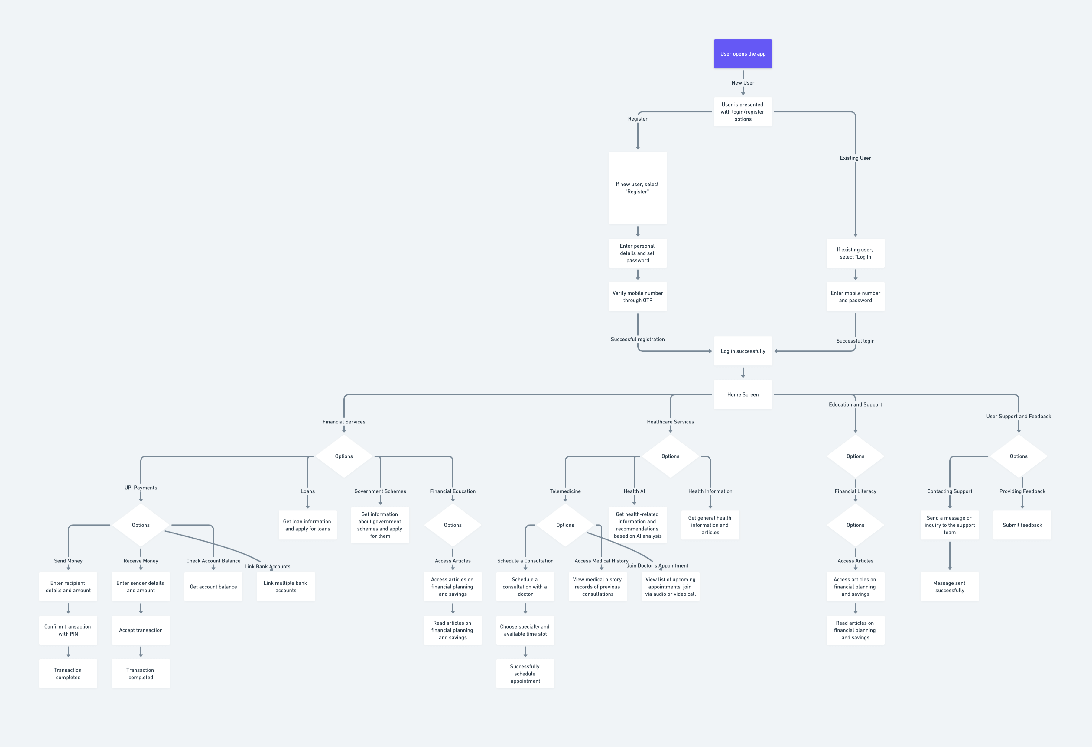 This user flow outlines the main features of the tvam app, including login/registration, financial services, healthcare services, and user support. Users can navigate through these features to manage their financial and health needs effectively.